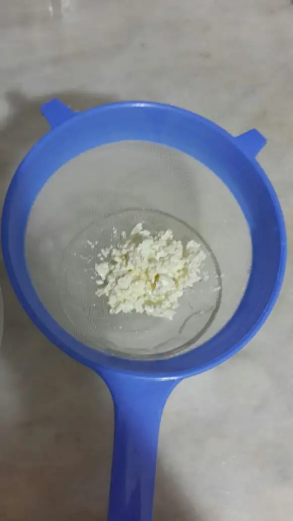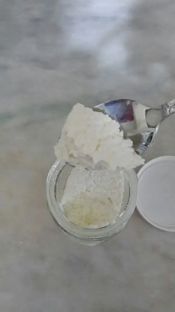 24 saat sonra acinca ustte bal petegi gibi maya, altta su olusmus. Peynir alti suyu deriz. Ondan olusmus. Hatta kavonozu acinca kokusu eksi peynir gibiydi. Tattim ama tadi yok. Nette de oyle diyr. Suzdum. Suzgecte kalan maya. Yaklasik 2.5 tatli kasigi.