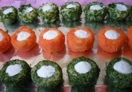 Patatesleri soyup haşlayın. Karıştırma kabına alın bir ezici yardımıyla patatesleri ezin. Zeytinyağ, tuz, karabiber ekleyin ve karıştırın. Diğer tarafta maydanozları ince ince doğrayın, havuçları soyup rendeleyin. Ayrı bir kapta sarımsaklı yoğurdu hazırlayın. Patates karışımından ceviz büyüklüğünde parçalar yuvarlayın. Yarısını doğranmış maydanoz, diğer yarısını da havuç veya toz bibere bulayın ve parmağınız yardımıyla ortalarını havuz biçiminde açın. Sarımsaklı yoğurttan kaşıkla alıp havuzların ortalarına koyun. Servise hazırdır, afiyet olsun.
