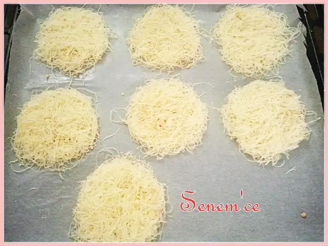 ≈ Kadayıftan parçalar alıp elimizle yuvarlayıp üzerinden bastırıp inceltiyoruz ve yağlı kağıt serdiğimiz fırın tepsisine diziyoruz.