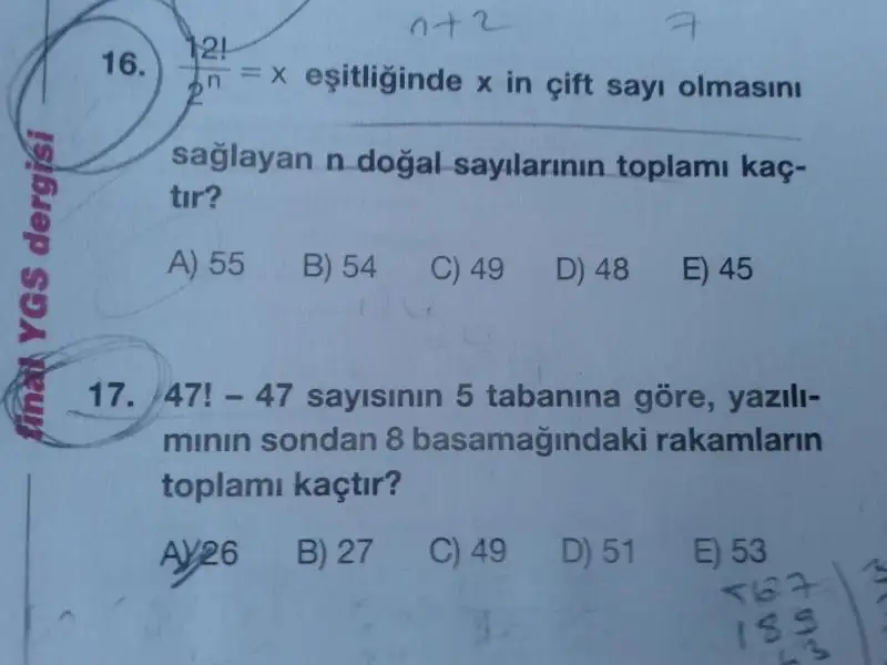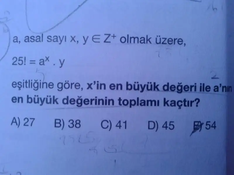 xin en büyük değeri için ise 2 üzeri kaç olabilir diye bakıyorum. içinde 22 tane 2 çıkıyor. Toplamı 45.Cevap anahtarı 54 mü diyor ? İnceledim bir kaç kez ama çözümü çok büyük ihtimalle böyle, cevap anahtarında problem olabilir.