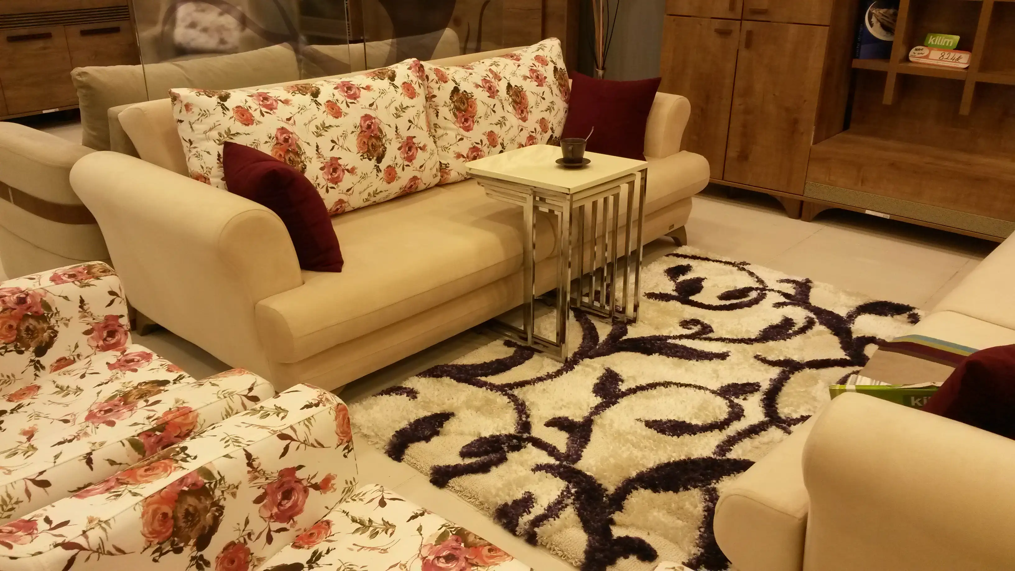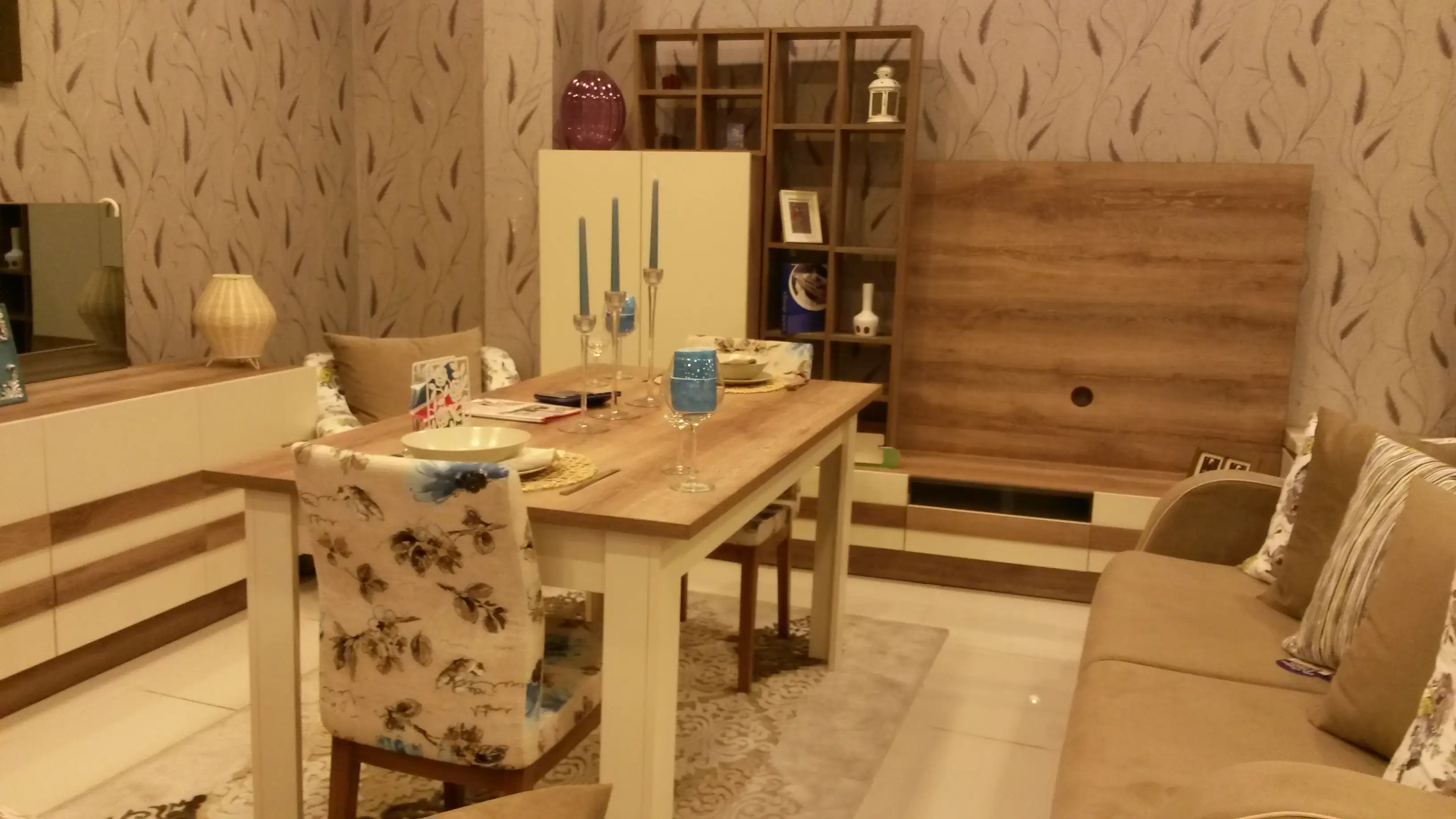 Yemek odasinda tv unitesi, vitrin, konsol, ayna, yemek masasi (acilabilir) ve 6 sandalye var, sandalyeleri deri degil kumas istedim, yandaki 4tanesi koltugun yuzey rengindeki kumastan olacak bej rengi, baslardaki 2sandalye fotograftaki gibi mavi :) sandalyenin kumasi da leke tutmuyor ve isteyince makinede yikayabiliyorsun asagida bir vida var onu acinca cirt cirtla cikarabiliyorsun :)