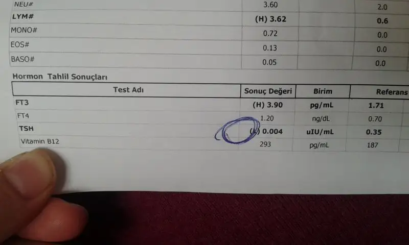 Canım hamile kalmadan önce hafif vardı sonra çarpıntı için ilaç kullandım düzeldi sonra hamile kaldım doğum yspalı 4 buçuk ay oldu işte ellerim titriyor halsizim diye gittim sağlık ocağına bu sonuç çıktı çok kötü hemen doktora git geç bile kalmışsın daha önce niye gelmedin hata etmişsin çok dedi bebekle uğraşmak fark etmedim ki hiç :(