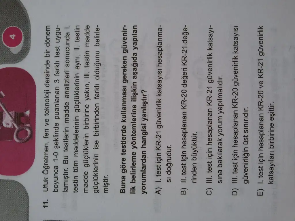 teşekkür ederim. tabii açıklarım ne demek :) paragrafta üçüncü testin madde güçlüklerinin birbirinden farklı olduğu belirtilmiş. c şıkkına baktığımızda kr 21 kullanılarak yorum yapılır demiş bu yanlış çünkü kr 21 madde güçlüğü aynı olan maddeleri yorumlamak için kullanılır. işte bu yüzden cevap c oluyor![]()