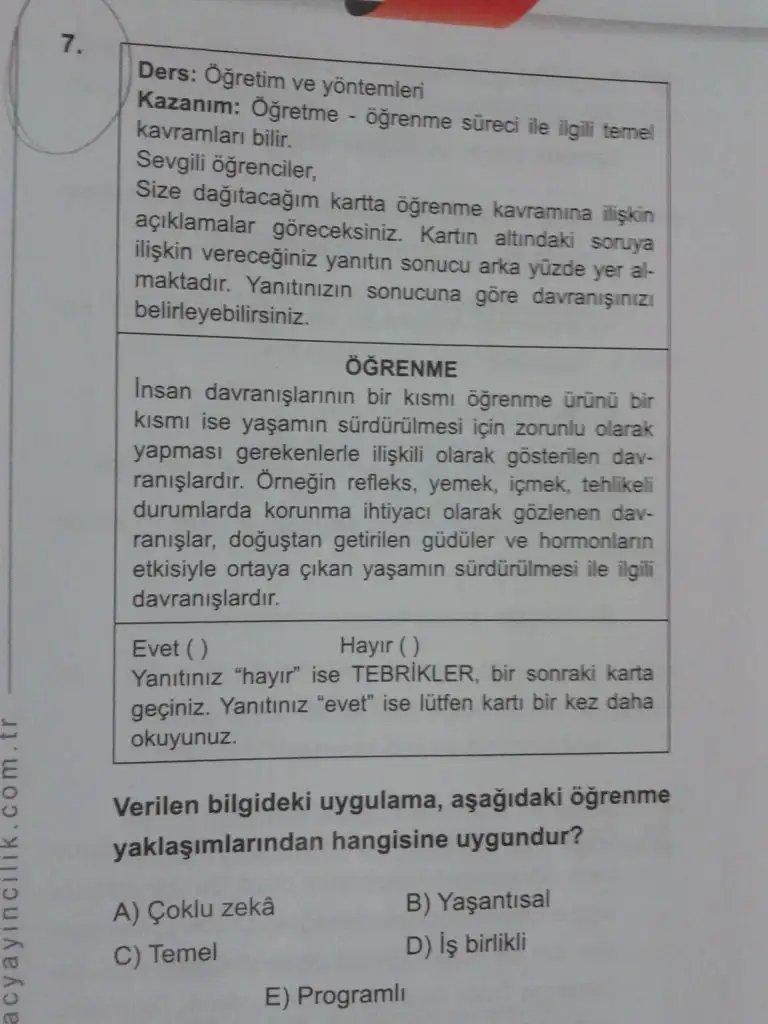 programlı öğretimde öğretim kişiye göre düzenleniyo yani bireyselleştiriliyo. öğrenci kendi hızına göre ilerliyo. yanlış yaptığında anında dönüt düzeltme veriliyo. en az hatayla öğrenmesi sağlanıyo. burda da o yapılmış. diğerlerine gelince 2)C 7)B mi?