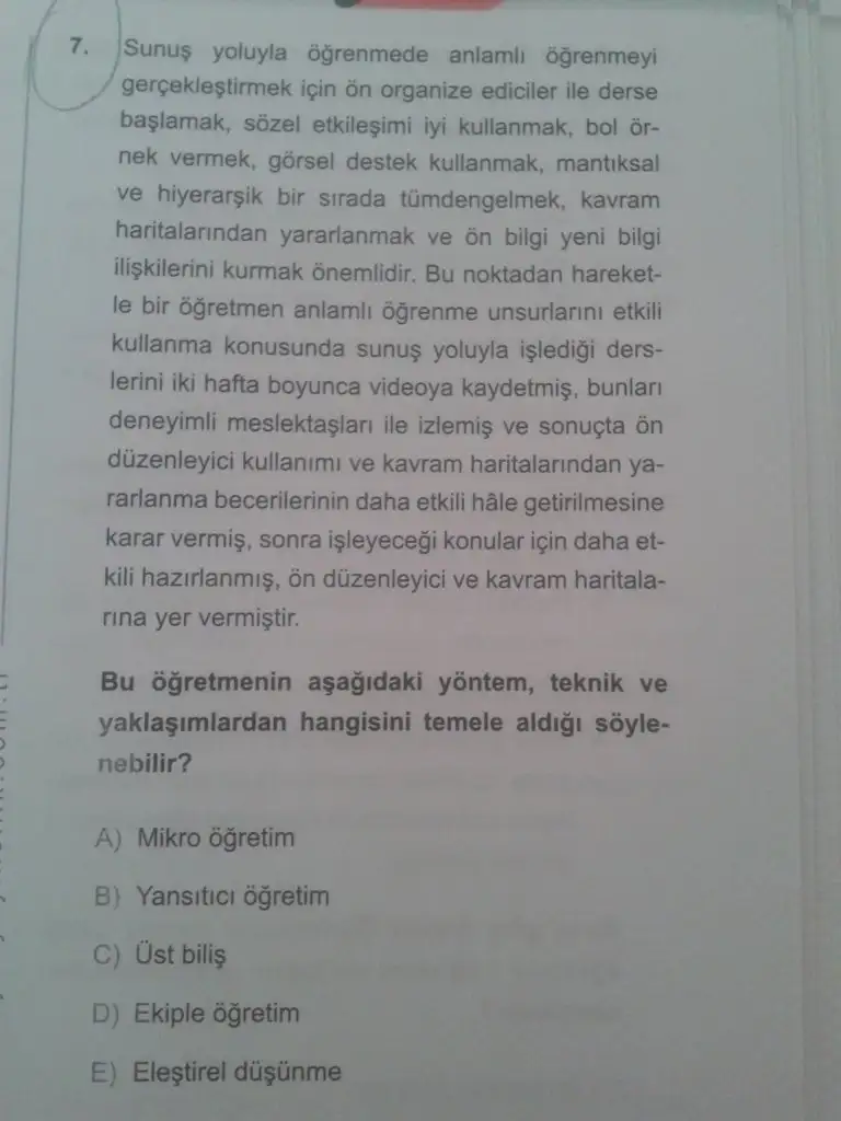 canım ben ilk önce video kaydı yaptığı için mikro demiştim. yansıtıcıyla mikro arasında kalmıştım, genelde seçtiğim yanlış cevap oluyor:KK51: yansıtıcı düşünmede yaptıklarından ders çıkarma ve aynı hatayı tekrar yapmamak var. burda da ilk ders anlatımını beğenmeyip kendini geliştiriyo. ama o video olayı bence çok alakasız olmuş. çift cevaba götürüyor. diğer soru da neymiş öyle yaa, pek açık bi soru değil:KK14: