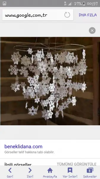 Bayıldımm bayıldımm hem konseptin farklı hem erkek bebekte ilk defa görücez:) elsa var ama o da kızlara..Anaa an kafam iyice çorba oldu kızlar :) Sağolun fikirleriniz için. O gri etek öyle düz bi etek değil bu akşam ona benzer birşey denedim anaaaam nasıl abiye oldu bildiğiniz nişan kızı gibi oldum bana kalsa kar konsepti diye bembeyaz elbise tercih edip salla renklendirecektim ama onda da sünnet anası gibi daha fenası gelin gibi olma riski var bi de mevlutteki de kırık beyazdı :)Pinking Tree praline aklımı çeldiniz yaaa ben düz model bi elbise bakayım o zman inşallah bulurum aradığım gibi diktirmeyi hic sevmiyorum. Mrssuperfine canım oğlusun da tam kafamda netlesmedi ama özel baskı kumas yapilabiliyomus dediğim renkler ağırlıkta araya da minik morlar atarak kar tanesi deseninde kumas yapılıp morluk askilarla tamamlanabilir gibisinden düşünüyorum üzerine de smokin dikmişler çok şirin olmuş ama dediğim deseni bulmam lazım sanırım baskı için :) Hediyelikler konusuna gelince şeker masasi diye tabir edilen masadan susleyecegim. 1 ve kar tanesi seklinde kurabiyelerim olur cupcake standım var ona cupcakeler koyarım mavili beyazlı şekerler kapakli cam kaselerde doğumdan kalma kolonyalaarim var etiketini değiştirip 1 diye onları da sıkıştırirım kar tanesi şeklinde kokulu taş olabilir bunları hep şeker masasına koyacağım. Mavi masa örtüsü üzerine masanın alın kısmına beyaz kartondan sarkıt deseni verilen bi örnek gördüm onu uygularım. Bi de kar tanelerinden tavan süsü örneği buldum yaparsam onu da tam pastanın geldiği kısmın üzerine koyarım filan filan. Konu dışına çıkmış olabilirim sen hediyelik demissin ben suslemeyi anlatmisim hosgor kendimi kaybediyorum konu doğum günü olunca :))) tavan süsü nun fotosunu ekledim. Bi de kar tanesi seklinde konfeti varmış mum uflenirken onu patlatsalar mi acaba hahahaha iyice costum ben Eki Görüntüle 1700554