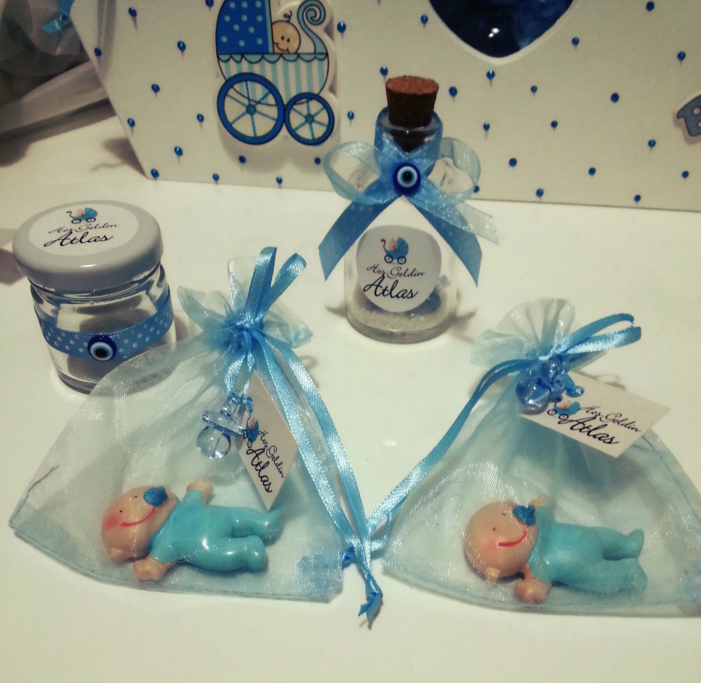 Tek bir ürün yapmak yerine az az 3 farklı hediyelik yaptım. Küçük bebek biblosu alıp magnet yaptım, onuda mavi keseciklere koydum diğerine ise hatıralık şişe alıp içine nazar boncuğu, deniz kumu ve deniz kabukları attım, minik kavanoza da mavi ve beyaz badem şekeri atacağım. Kızlar çok basit olmamış değil mi? Birde bunlardan birini duası için çoğaltacağım. Sizce hangisini çoğaltayım?Eki Görüntüle 1309366