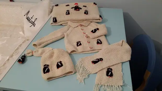 Ve oradaki örgü takımı da ananesi ördü tabikii. Penguenli hırka, bere ve battaniye. Atkısını da örgü örmekten aslında nefret eden teyzesi.
