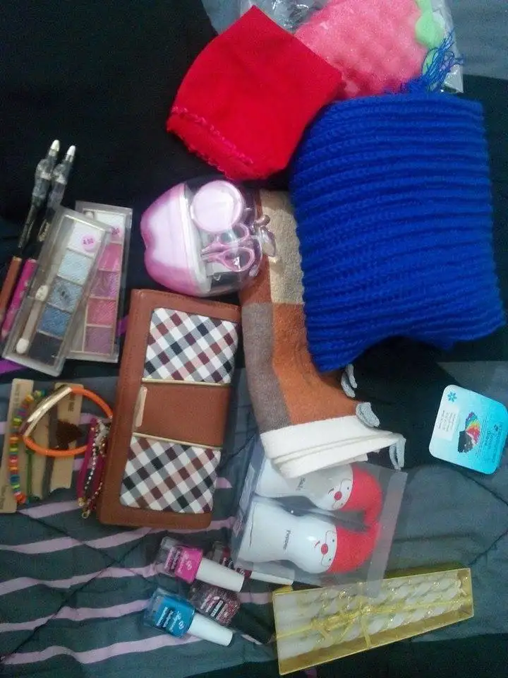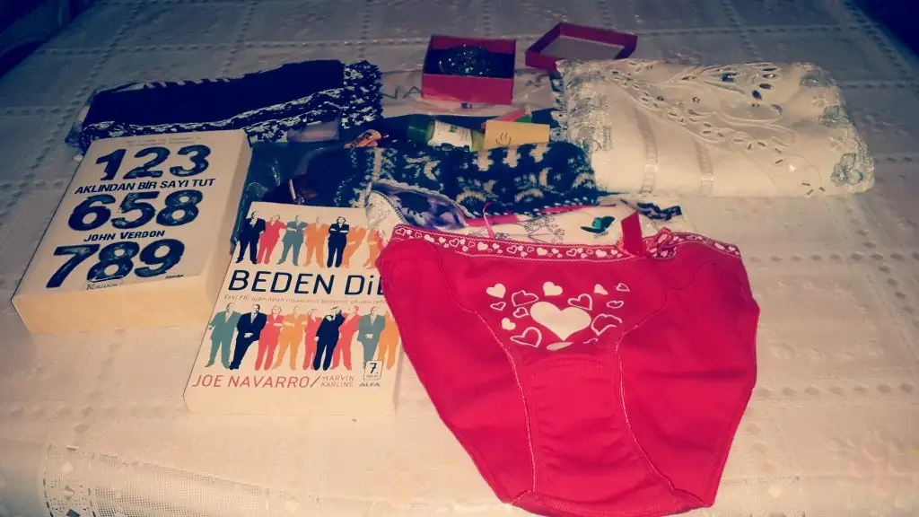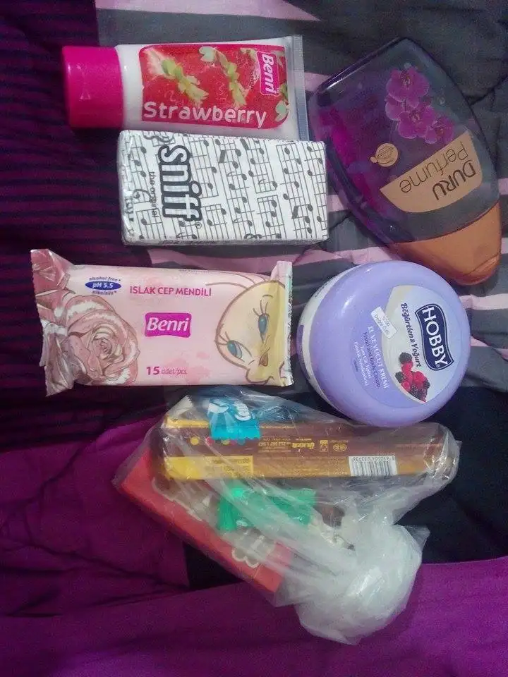 Bunlarda acılmis halleri. Sırayla 2 adet kitap, tulbent, havlu, patik, krem, anahtarlık, cok cici bi ayna, şal, 2 adet ic camasiri, yapiskanli notluklar ve cikolatam
