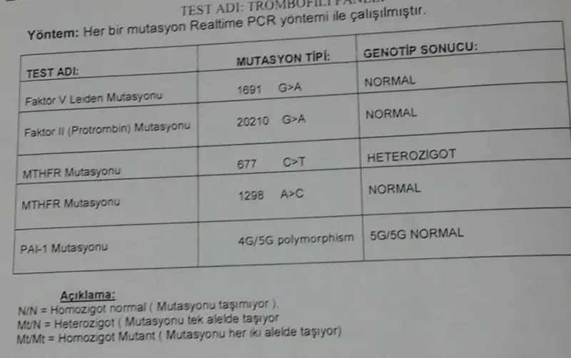 Canım heterozigot yazan gende bir sorun var sanırım ama o hangi gen onu dr un söyleyecektir. Diğerleri normal görünüyor. Benim anladığım.Kızlar bende pıhtılaşma varmı bakarmısınız?