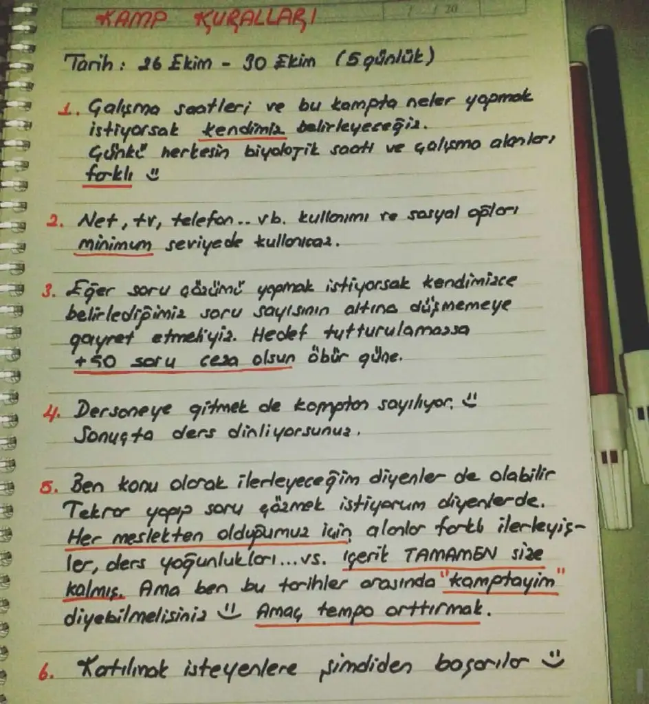 Senin için su 5 gün güzel bi firsat kuzum. Bence de kampa gir. Eminim çok verimli olur :)Benimde okulum var diye kamp yapamam dedim ama malum persembe cuma tatil cumartesi pazarda var yarinda ogleden sonra tatil bu hafta bu kampa uyabilirim diye düşündüm 5 günlük en azindan biraz ilerlemiş olurum turkce cografya tamamen bitmiş olur matematige başlarımburaya yazarım yaptıklarımı insallah
