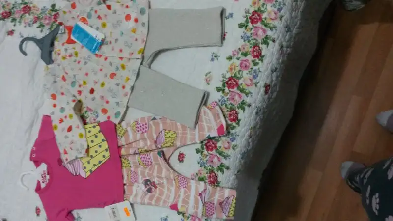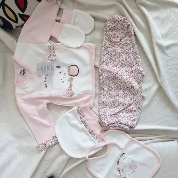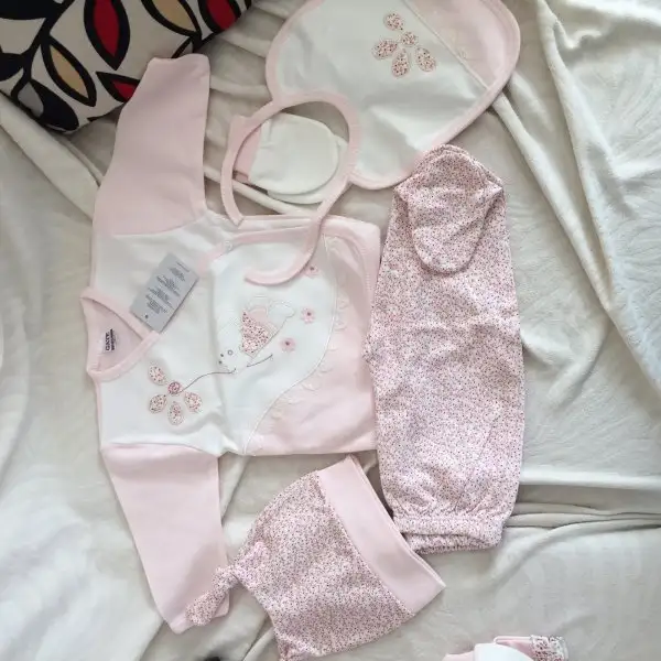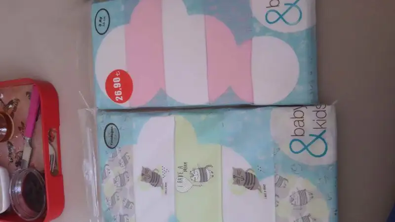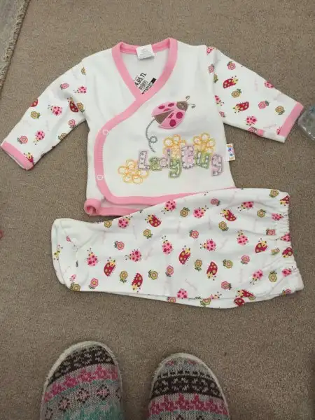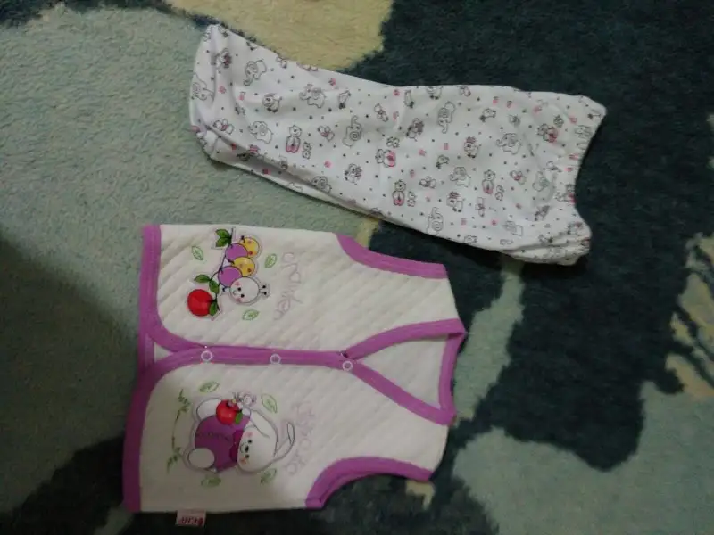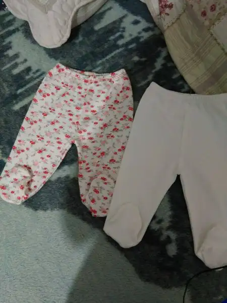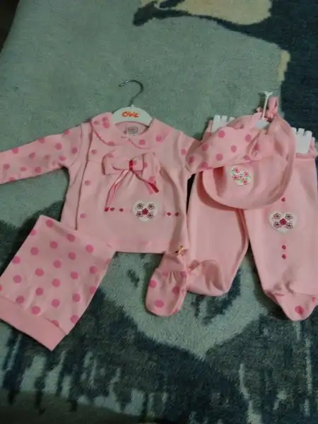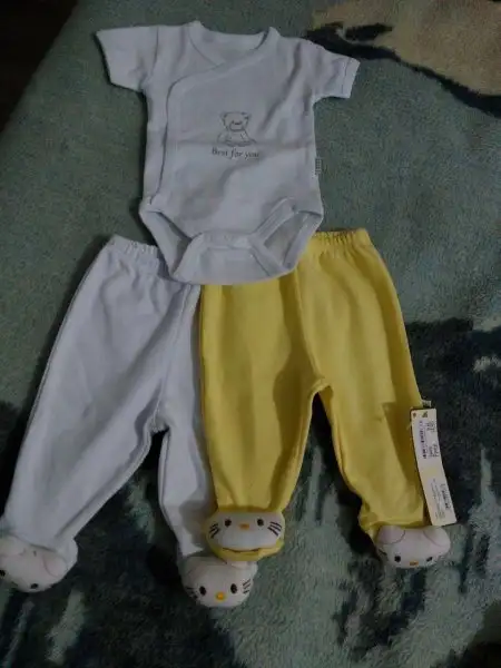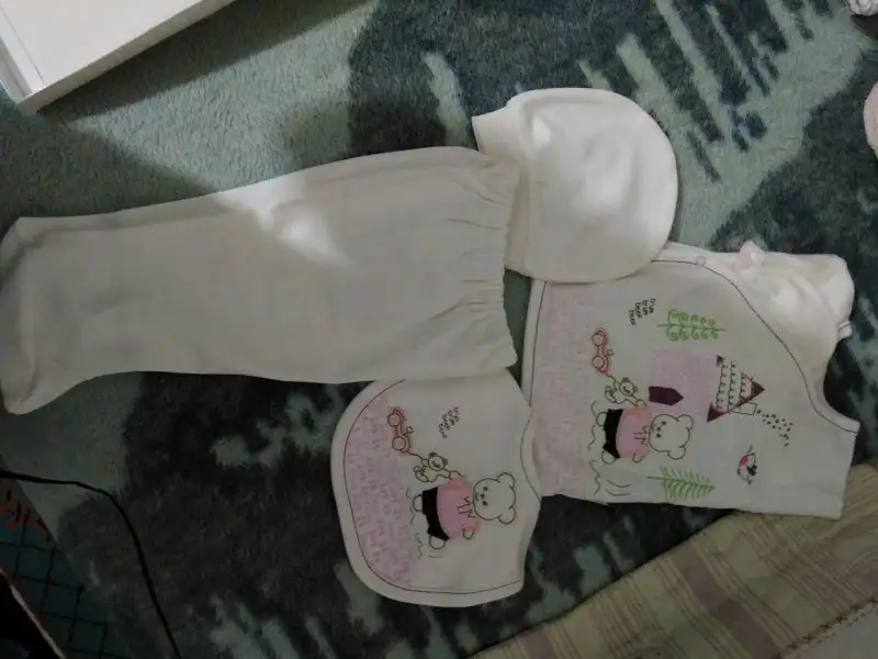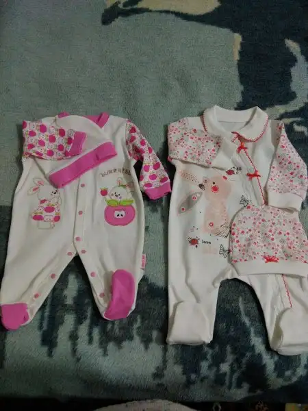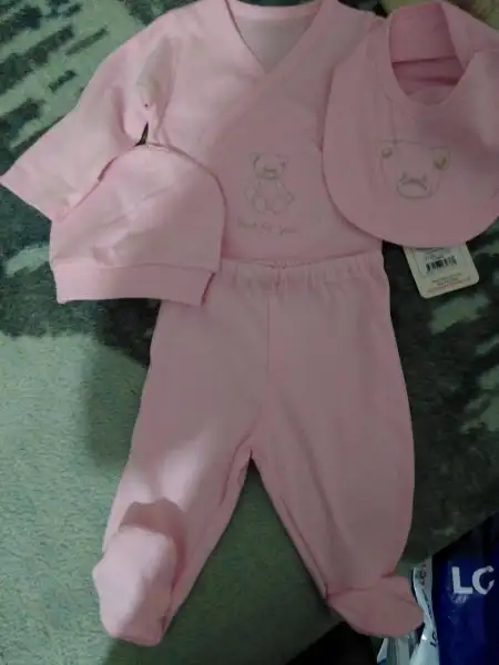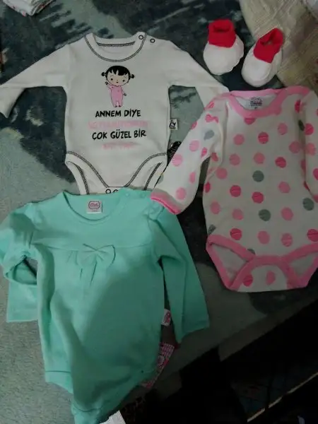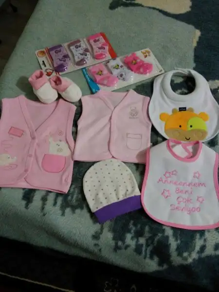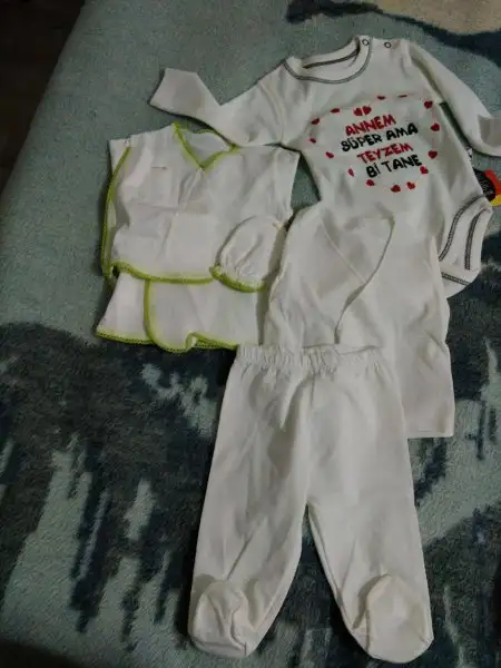 -2 iç zıbın takımı, 2 adet alttan çıtçıtlı body (bebeğin göbeğinden kan gecebilir diye fazla eşyalar. Hastanede giydirmek için zıbın istiyorlarmış)