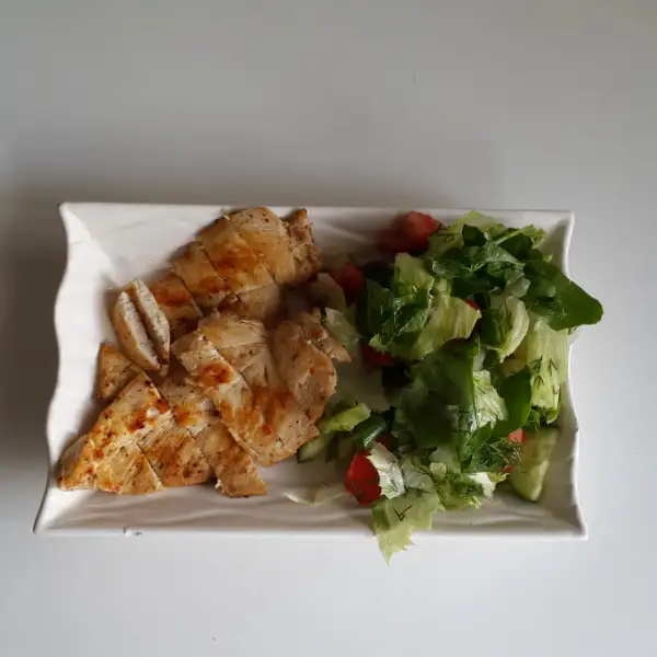Aksam yemegi; az yagli tuzsuz salata,yagsiz tuzsuz baharatli tavuk gogus