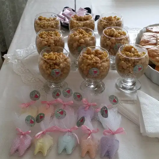 Ben diş buğdayını hazırladım. Yanına tuzlu kurabiye yaptım, eşim de karışık kurabiye pasta falan aldı :) çerez, kuru meyve falan ikram ettik :)