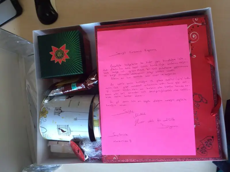 Kızlar hedıyelerım geldi canım kurbancıgımma çok çok teşekkür ediyorum öncelikle emeğine ellerine sağlık gerçekten çok mutlu etti beni hele ona nasıl bir güzel mektup öyle