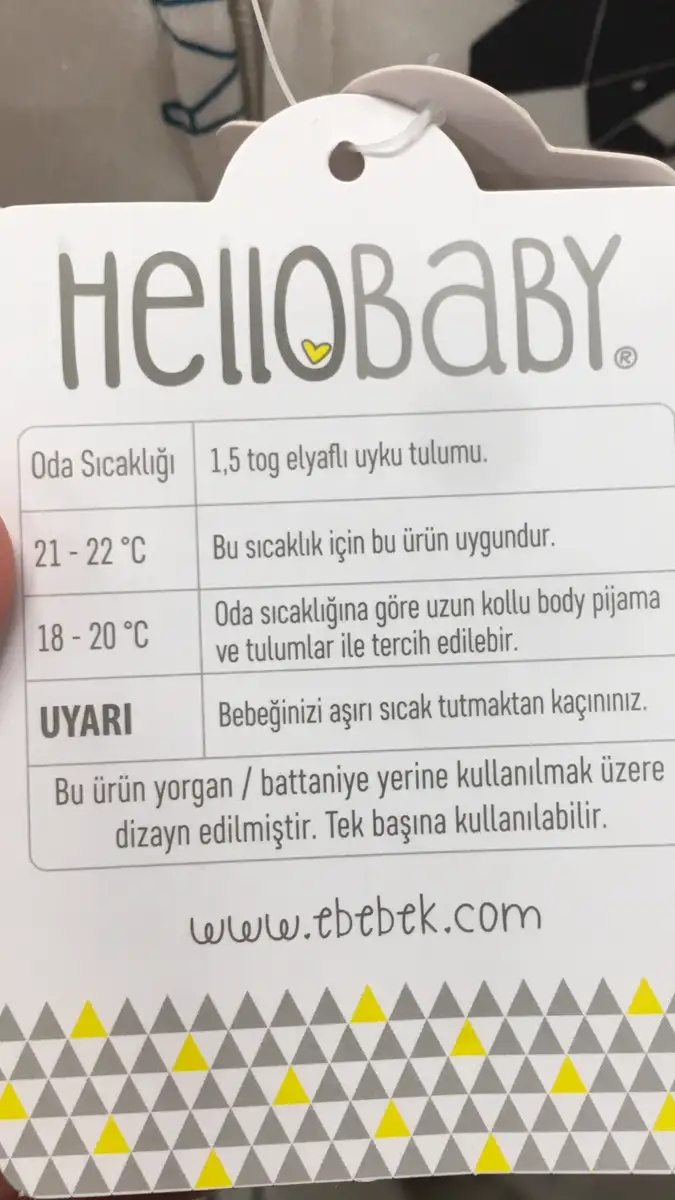İlk fırsatta alayım bunlardan, hava 2 gün sıcak seyretti hemen terlemeye başladı yine. Teşekkürler fotoğraf için, 1,5 tog tam ihtiyacım olan ölçü aslında ama yerel bebek mağazalarında çok bulunmuyor, avm’ye gitmeyi de ben sevmiyorum mecbur kalmadıkça, internetten alınca da 2 tane nurtopu gibi 2,5 tog tulumum olduŞöyle söyleyeyim gece gündüz 23 te tutuyoruz biz doğalgazı ve örtünmeyi hiç istemiyor , o yüzden direk pijamalarının üzerine tulumunu giydirip yatırıyorum. Hiç terlemedi.Hatta bak ürün etiketini almadan önce fotoğraf çekmiştim, telefonumda kayıtlı kalmış.