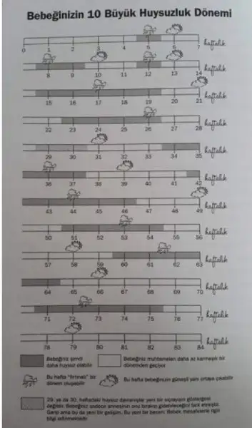 Doğması gereken tarihe göre hesap edip bu tabloya bakabilirsin. Bikaç gün sapma oluyor galiba. Bizimki geçtiğimiz hafta çok huysuzdu. Tablodaki 5.haftada görülen kısımdaymışız. Dünden beri daha iyi, atak haftası bitti ama bikaç gün daha gözlem yapmam lazım , gerçekten böyle bişey var mı doğru mu diye. Gün içinde kendi başına 15dk lık oyalanmaları oldu iki defa, şaşırdım