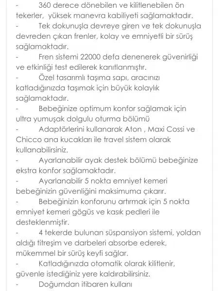 güle güle kullanın :) bnm oğlan çok hareketli hep yürümek istio ondan 2. bir arabaya para vermek istemedik seneye yaza hiç binmezse diye duruma göre kışı atlatıp bakıcaz bizde elimizde ki travel ı satıpCanım ancak vakit bulup ebebek mağazasına uğradık sabah sabah ve düşündüğüm arabaları denedim tek tek. Chicco ohlala bebek için diğerleri kadar konfor sağlamasa da hiç fena değildi bence, çok hafif , uygun fiyatlı ve kullanışlıydı ancak 15 kg mış kapasitesi bu nedenle tercih etmedim. Senin de belirttiğin gibi mamas&papas daha hafifti ancak benim cadı o kadar araba içinde en çok maclaren techno xt de rahat etti gibi geldi gıdı çıkmadı ayaklarını istediği gibi uzatabildi. Eşim de bu daha rahat bunu alalım diye tutturunca maclaren techno xt aldık çıktıknormalde 2018 modelleri 2800 tl ve söylediğin gibi çok indirim vardı 1280 e aldık. Tekrar teşekkür ederim