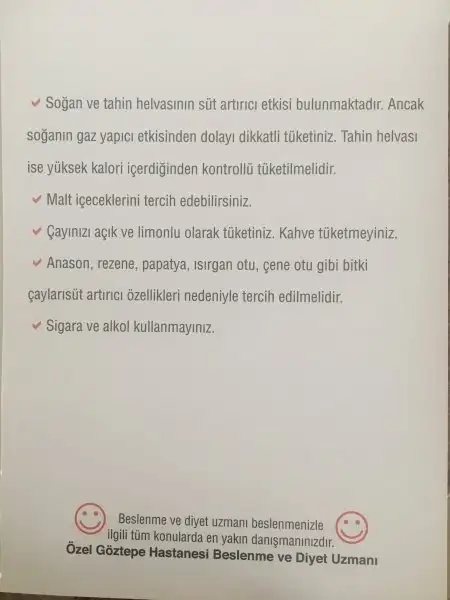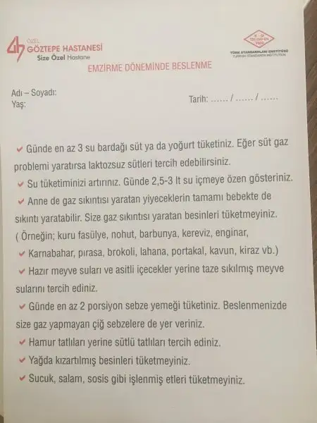 Canım bana hastaneden şunu verdiler. Bu listeye uymaya çalışıyorum.Kizlar selam ya siz neler yiyorsunuz gaz yapmayan yiyeceklere bakiyorum hersey gaz yapiyor nette yiycek bisey yok hersey gaz yapiyor masallah hem sutu verimli yapan hemdr gaz yapmayam neler var
