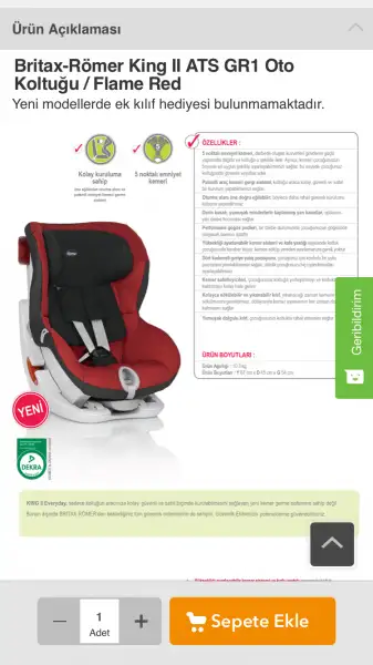 Anladım cnmCanım benimki de 9-18 kg, britax römer king II modeli. Isofixli değil, kemerle bağlanıyor ama inanılmaz kolay. Bak özellikleri atıyorum. 1200₺ aldık biz.