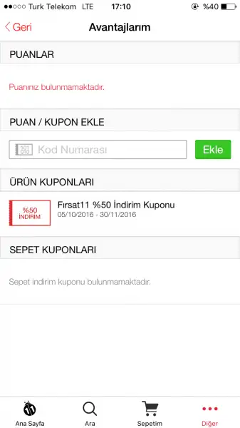 uygulamasını pek kullanmadım ama bildiğim kuponlar alışverişi tamamlarken kullanılıyor canım. bi alışverişe devam et, ödeme yapmadan indirim kuponu gir vs diye bi yer vardır ille, bi dene istersen. :/