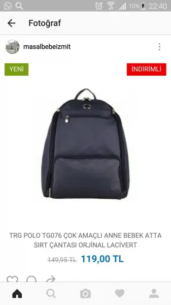 Eğer bu çantayı duşunuyosanız n11de daha uygununu gordum az öncee. Kargoda ücretsizdi sanırım. Sırtta duruşuda var birde fotoda. Modeli güzel ama sırtta kabamı duruyor biraz sizceeBen daha önce bu instagram sayfasını burda paylaşmıştım canım güzel modeller var. Hatta sırt çantası düşündüğüm için ben de polonun bu modelini beğenmiştim :) Fiyat olarakta uygun gözüküyor. Müşterileri de genel olarak sayfadan memnun.