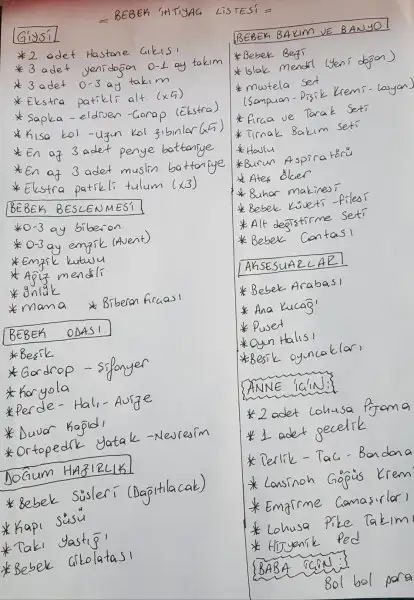 Baba için olan kısmına çok güldüm:)) Paylaşımın için teşekkürler. Benim Oğlumdan büyük parçalar var, yatak, bebek arabası, puset, mama sandalyesi vs..Mayıs 15 ten sonra eksikleri tamamlamayı düşünüyorum. .Merhaba kizlar baya geride kalmisim dunden beri 250 sayfa okudum sanirimcok fazla yazmasam da giremedigimde acaba kimler ne durumda diye isim isim gecirmeye basladim aklimdan walla :) alisverisler tamamlanmaya baslamis baya baya ben de kendimce arastirip soyle bir liste yaptim bi goz atarsiniz belki isinize yarar veya eksikler varsa fikir verirsiniz