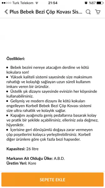 Canım ben banyoya bebek bezi için küçük bi çöp kovası koymuştum her akşam da çıkarıyordum çöpü dışarı. Böyle bir şey almadım.