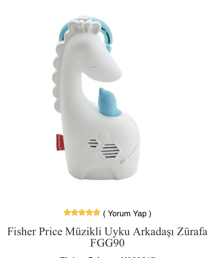 Fisher price zürafa uyku arkadaşı var bizde. Serra 1 aylıkken almıştık hala onu kullanıyoruz. Fön makinası sesi ve su sesi var ayrıca uyku müzikleri de var. Ses ayarını kendin yapabiliyorsun. Çok memnunuz.