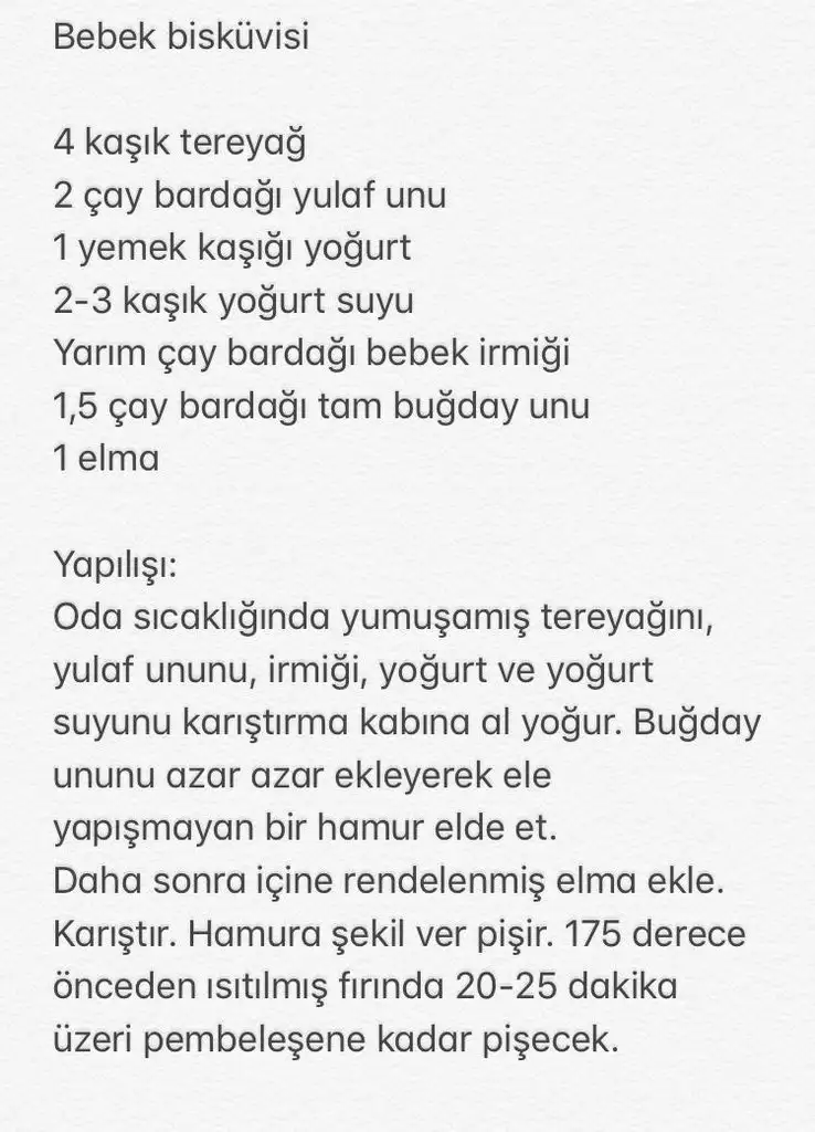 Bisküvi tarifini verir misin canım severek yiyor muYumurta sarısı, labne yada suda bekletilmiş yağlı peynir, pekmez, tereyağ, anne sütü yada formül mama ile ezilmiş bisküvi. Yumurtayı bazen haşlayarak bazen yağda veriyorum. Bisküviyi kendim yapıyorum. Yulaf unu buğday unu ve irmikle. Tatlandırıcı olarak da elma katıyorum.