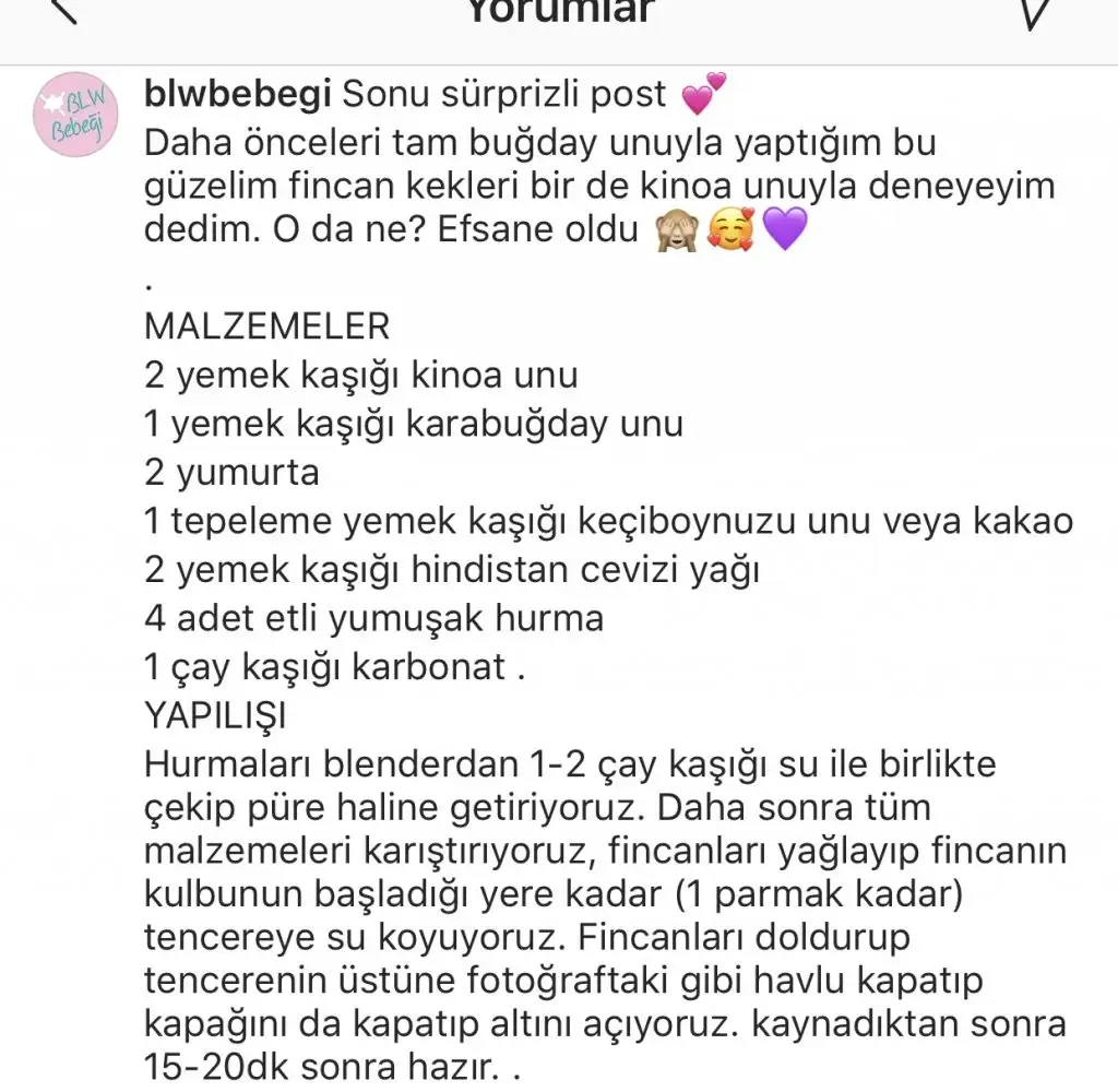 Tariflerin ekran goruntusunu atiyorum. Ben karabugday unlu olani yaptim ama kinoa unum yoktu onun yerine de yulaf ve nohut unu karisimi koydum. Ve ekstradan cektigim cevizleri de koydum. Bence tadi cok guzel oldu:) bide boyle yumus yumus tam bebek keki:)