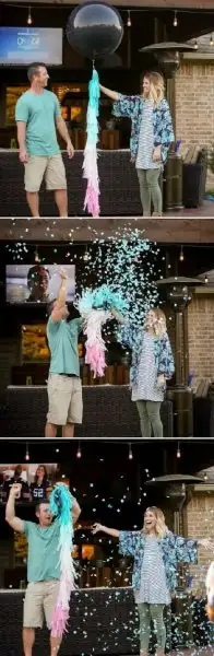 Koyu renkli balonların içine cinsiyetine göre mavi veya pembe kağıtlar doldur sandalyeye bağla balonları, sonra eşinden patlatmasını iste. Bebeğin cinsiyetine göre kağıtlar yere dökülür ve cinsiyeti öğrenir :)