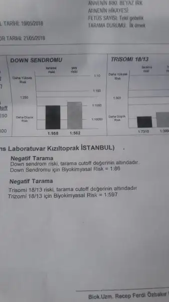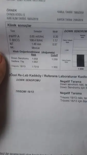 Dogru soyluyorsun canim ama hani risk grubunda gorunmuyorum rapora gore hani cuttoff degerinin uzerinde dese yinede cok para ama yaptirim derim ama internettede arastirdim 1/250 ustu olmasi lazim pozitif tarama olsun diger testler istensin benimki negatif tarama ve altinda deger