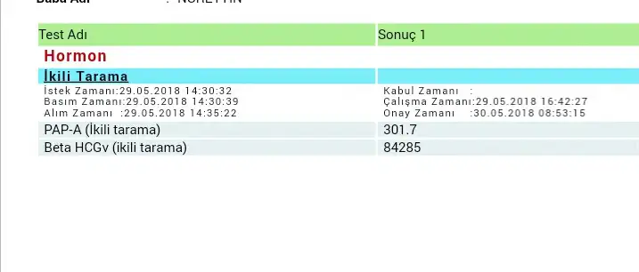 Merhaba canim testin eksik daha bunlarin duzeltilmis mom degerleri lazim o da ense kalinligi ile yas da katılıp ortaya bir risk cikacak. Sadece bu iki degerle bir sonuca ulaşılmıyorGünaydın arkadaşlar.ben daha henüz 2 gün önce ikili test yaptırdım.meraktan baktım sonuç çıkmışmı diye ekranda bunlar yazıyordu.nedemek bu acaba yorumlayabilen arkadaşlar varmı.kafama takıldı.doktor iki hafta sonra çıkar demişti sonuçlar.