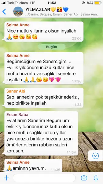 whatsapp kullanan kayınvalide diyorum ve ağlamak istiyorum. zira bizimki instagram bile kullanıp biyerde fotoğraf video attığımda hemen eşime yazıp beni niye almadınız diyen birisi idi. instagramdan engelledim whatsappta da herzaman paylaşım yapmıyorum mutluyumSelam kızlar, bu paylaştığım fotoda selma anne yazan kaynanam olur kendisi, eltimlerle evlilik yıldönümümüz gün olarak 1 gun arayla. Üsteki mesajı kaynanam bize yazdı, alttaki begümcüğümle başlayanıda eltime