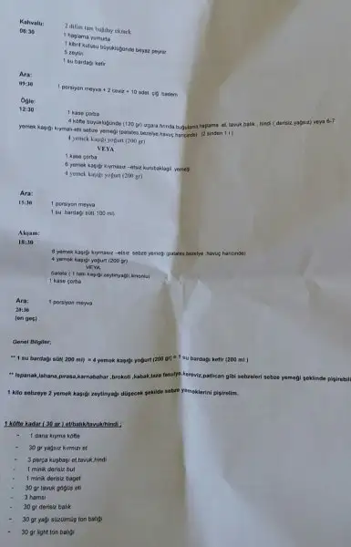 Diyetisyene gittim bugun. Bu listeyi verdi bana. Cok kilo aldim ben boyum 160 kilom 69. 61 kilo ile basladim hamilelige. 10 gun sonra randevum var yine. Bakalim neler olacak. Bakiyorum listeye baya az yemek var yahu ama yapicam ya baska carem yok. Yilbasi gecesi biraz sikinti olabilir ama tutacagim kendimi. Umarim :)