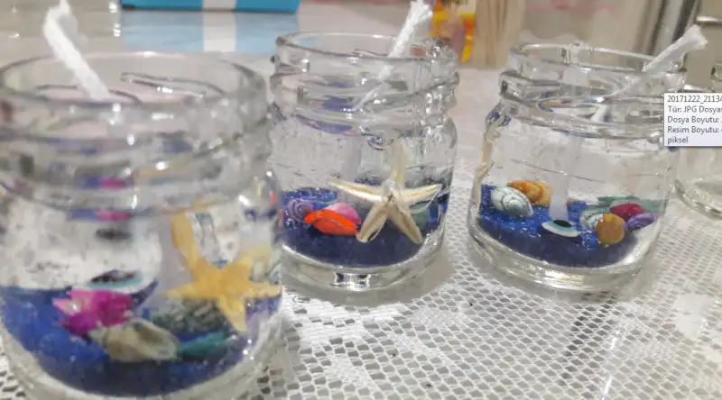 Jel mum aldım internetten renkli kum , deniz kabukları, deniz yıldızı , esans, mum ipi falan aldım.Sağol canım bilgi için. Ben de kavanoz kapaklarını süsledim ama mum mu yapsam badem şekeri mi koysam karar veremedim. Yapılışını kısaca yazar mısın müsait olunca?