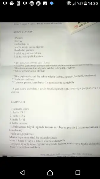 Gunluk menumuz degisiyor zaten cnm hergun muhallebi vermiyorum birgun meyve puresi birgun yogurt sabah corbayi guzel yediyse uykuya sade anne sutuyle geciyoruz corbalara un kullanmiyorum et sulu yapiyorum genelde yada yumurta ve yogurt terbiyeli corbalari cok seviyorBenim bebe zayif oldugu halde irmik
