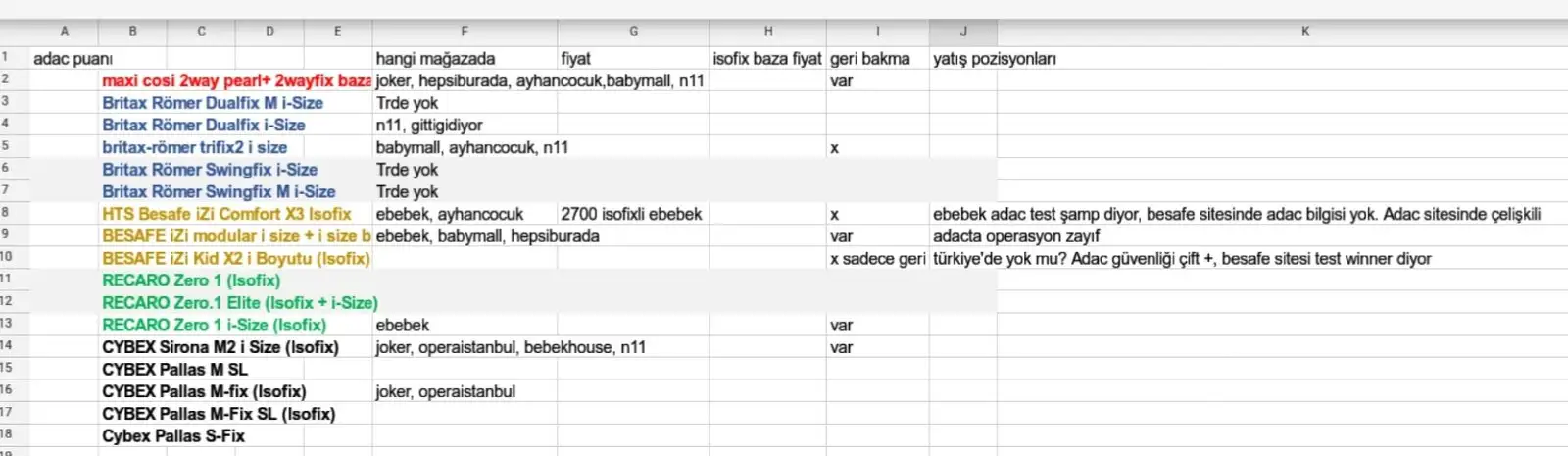 Eğer paylasirsan cok sevinirim. Biz dun aceleyle baktik .Çünkü hesapta olmayan bir gezmeydi .1 saatimi komsunun yenidogan bebegine elbise secmekle gecirmisim.Sebebi de gittiğim avm de rampa yuruyen merdiven yok .Asansor bekle lcwa ve e bebek arasinda git gel derken ...tablo yapıyorum şimdi özellik karşılaştıran falan. Bir de bugun gidip babymall ve jokere bakacagız, dun ebebeke baktık, oturtmayı deniyoruz.. Bütün bunlara göre fiyat performans olarak bakıp birini alacağız ama Şubat indirimi bekleyeceğim. Bu arada ilginc birsey diyeyim, ebebek.comda 3600 kusur olan besafe izi comfort x3 ebebek anatolium magazada dün 2600du. magazalarda fiyatlar farklı olabiliyor demek, dikkat etmek lazım .istersen benim tabloyu da paylasırım