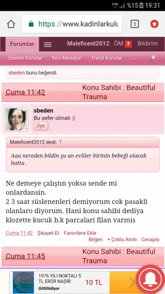 M Maleficent2012 canım dur durduğun yerde, tek kiblenen msjına bakılmıştır muhtemelen .. Oralara bende bakıyorum bazen ama kızların da dediği gibi gereksiz msjlara cvp yazınca olmuyor..Arkadaşlar buyrun banlanma sebebime bakın. Konu sahibinin derdi ev arkadaşları ile bende kendi ev arkadaşlarım hakkında yorum yaptım ve alakasız bir üye gelip bana sen pasaklı olanlardan misin hatta ileri giderek hani şu klozette b*k parcasi olanlar konu sahibinin bahsettiği dedi . Yoruma bakarmısınız bende onun üslubuyla ona cevap verdim ve sonradan hatta yanlış anladığımi düşünerek özür diledim ve yorumumu duzelttim ama banlanan ben oldum bu nasıl bir şey? Gayette doğru anlamışım üye bildiginiz durup dururken bana sataşmış banlanması gereken kim di acaba ? Üyeliğimin iptalini istiyorum . Böyle adaletsizliğe hayatımın hiç bi yerinde katlanmadigim gibi burada da katlanmam . Sevdiğim , özel mesajlastigim ve paylaşım yaptığım arkadaşlarim sizler hakkınızı helal edin .