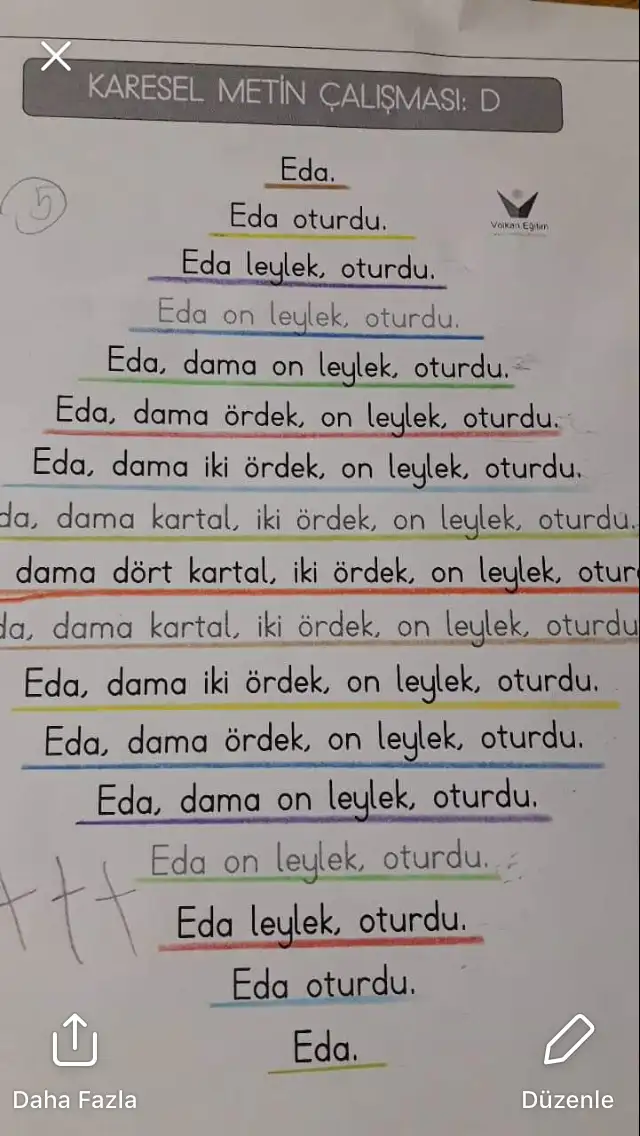 Bizim ufaklık çok ezberci. Bir kez okuyor ve ezberliyor. O metinlerin hiç faydası olmuyor bize... Bakmadan söylüyor maalesef. Evet harfi vurgulamak için yapıyor. Alıştırmaya çalışacağım. Çok teşekkür ederim tatlım. Kızına da başarılar dilerim.Dakika tuttuğum oluyor elbet ama kelime saymıyorum.5 kez okuyacaksa ilk okumayı tutuyorum bir de 5.okumayı dakikaya tutuyorum aradaki Hızı görüp şevke geliyor.ama hiç kelime saymıyorum.öğretmenimiz de saydırmadı inşallah saydırmaz.bunlar yeni öğreniyor yavaş yavaş hızlanacaklar.okuduğunu anlamadıktan sonra hızlı okumanın bir anlamı kalmıyor