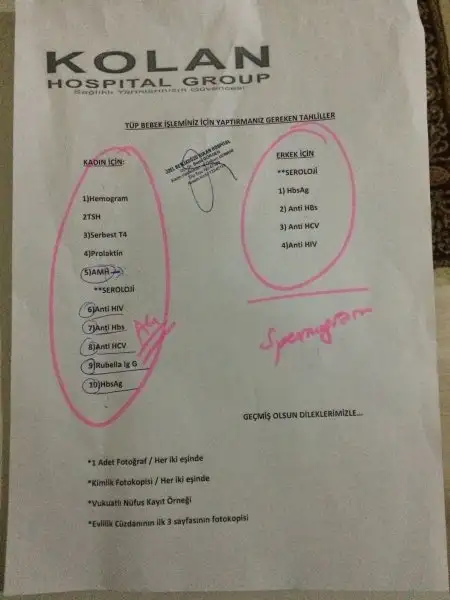 canım ben tüp bebekden önce rahim filmi hormon testi sperm testi yaptırıp bu sonuclara göre rahim filmi temiz cıktı eşimin sperm testinde problem yok dediler ve 4 senedir korunmadık ve cocugumuz hiç bi şekilde olmadı. Neyse klomen kullandm 4 defa ama yumurtalık olustu hamilelik olusmadı en son klomem kullanımda yumurtam büyürken gerilediği soledi doktorum ve gonal f iğnesi verdi benimde sinirlerim bozulunca doktorumu bıraktım 2 ay ara verdim bole olmayacak ben en iyisi normal kadın dogumda bu kadar para dokecegme direk tüp bebek uzmanuna gidip bütün tetslerimle birlikte gittim. Doktorum bana tedaviye başlamamız için hormon + sperm testim 1 yıl once olduğu için tekrar yaptırmamı istedi şimdi onlar yaptırıp doktorun karsısına tekrar cıkacagız. doktorum eski tahlillerle yeni tahlilleri karsılastrıp aşılama mı tüp bebek mi karar vereceğiz dedi bakalım neler bekleyecek beni:) istediği testler gene daha önce yaptırdığım testleri güncellemem gerek. ekte istediği testlerAllah hayırlı etsin gebelik haberini de okuruz inşallah :) bizim bütün masraflar 11.000₺ civarı tuttu. Şu an hangi aşamadasin ?