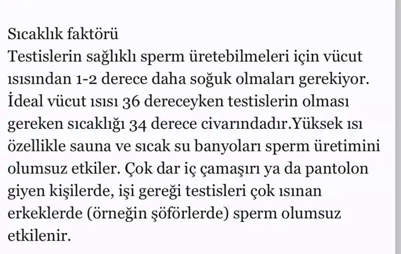 Ay bilmiyorum ya keşke yapmasaydım,şimdi kendini suçlar dururum.evet kadınlar için sıcaklık lazımmış ama spermin yaşaması ve hizi içinde soğuk ortam lazimmis.ikisi bir arada nasıl olacaksaYanlız anladığım kadarıyla sıcaklık erkekte olmamalı . Eğer sıcaklık erkekte olursa sağlıklı sperm üretimi olmazmış . Biz gelen spermi sıcaklıkla kalitesizleştirebiliyor muyuz ona dair bir bilgi yok okuduğum forumlarda . Bu hamamla saunayla kaplıcayla gebe kalanları da doğrular nitelikte oluyor sanırım . Olabilir mi ? @Sosyaljo