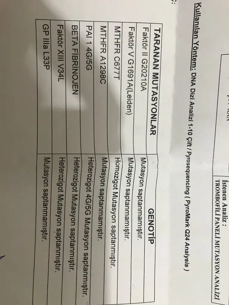 Benimki de mtfrh 1298 homozigot çıkmıştı canım, hematolojiye yönlendirdi doktor, o da onu önemli görmedi, coraspin kullanabilirsin ama zararı yok dedi, 6. ayda tekrar görüşelim dedi bir de, benim doktorum ama biraz titiz, sen onu boşver iğneye başlarız dedi, inşallah sıkıntısız atlatmak nasip olur, sende pai de var galiba, onu biraz daha önemli görmüş olabilirler belki, okuya okuya alim oldukAmin kuzumiğneyi niye geç vurmaya başlayacaklarmış acaba pıhtılaşma çıkıp geç başlayanı ilk kez duydum canım bana birkaç alanda pıhtılaşma var dediler. Bak sonucum böyleydi.