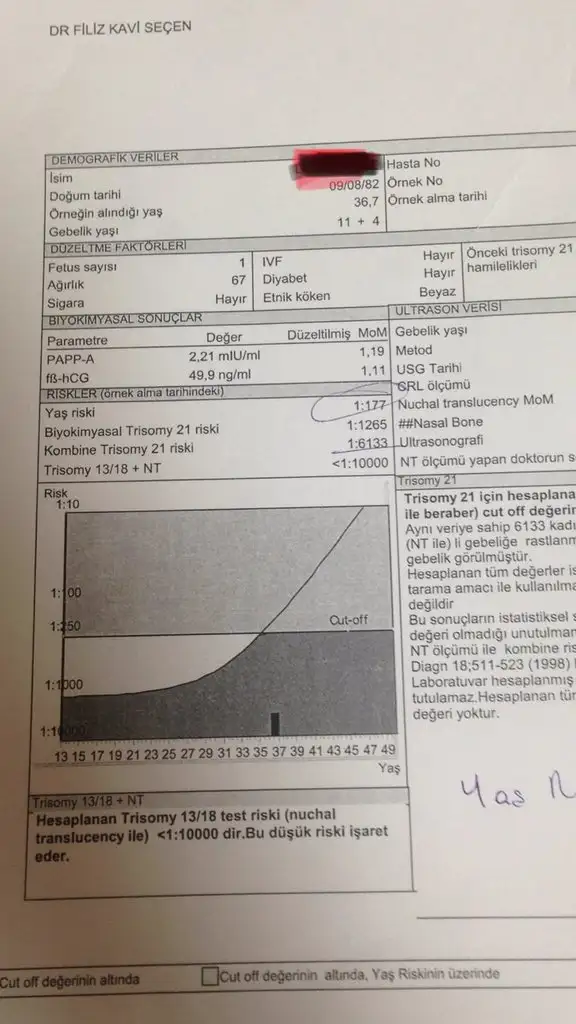 Pappa ve hcg birbiriyle uyumlu bildiğim kadarıyla. O yüzden iyi. Sağ tarafta ultrason ölçümleri var sanırım. Onu göremiyorum canım. En altta genetik rahatsızlığın olma olasılığı onbinde bir den daha küçük diyor. İyi bence canım.