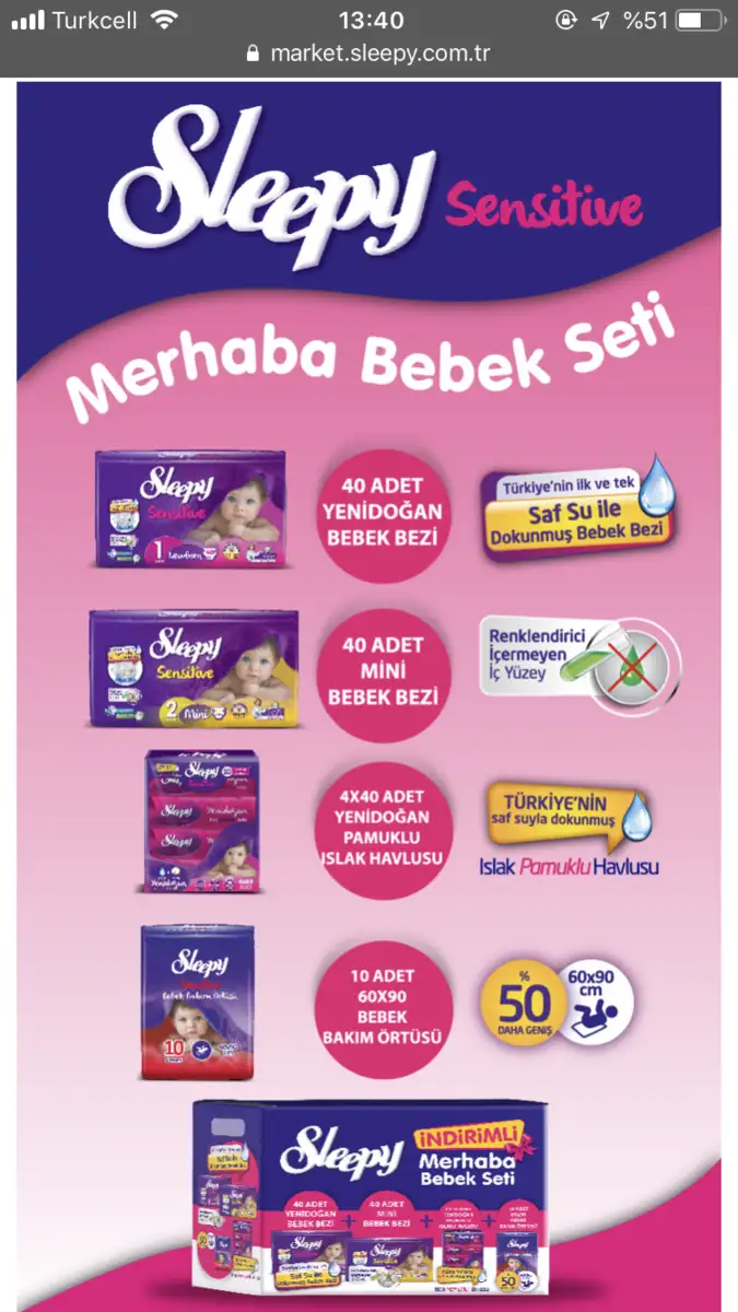 Sleepy nin merhaba bebek setini sipariş verdim iki adet sipariş verdim 100 tl tuttu bana çok uygun geldi kullanmak istediğim bez de buydu toplam 160 adet bez var ıslak mendil bakım örtüsü de bedavaya geldi gibi