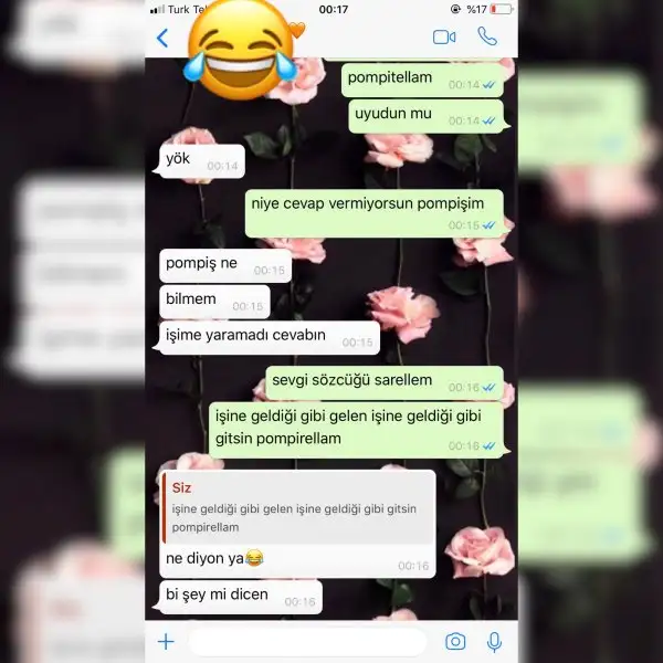 ya da “pompişkoşun köprüden geçene kadar mıydı? ben de istiyorum herkesin eşi gibi pompilipom olmak benim neyim eksik”Ayyy hayal edemedim"Sen bana eskiden pompişkoşum derdin,artık demiyorsun,beni eskisi gibi sevmiyor musun?"