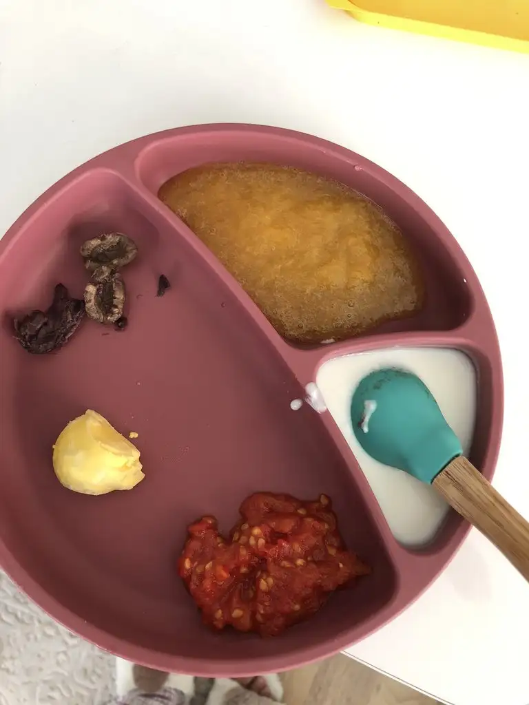 Yumurtamız bitti domatesimiz ve kayısı püremiz de bitti zeytin tam tuzu gitmemiş 1 tanesini verdim ben ezerek, yoğurt koydum ama vermedim Demir vermiştim yoğurdu kaseye aldım sonra yediririm dedimYenilenleride soylemis gibi vala