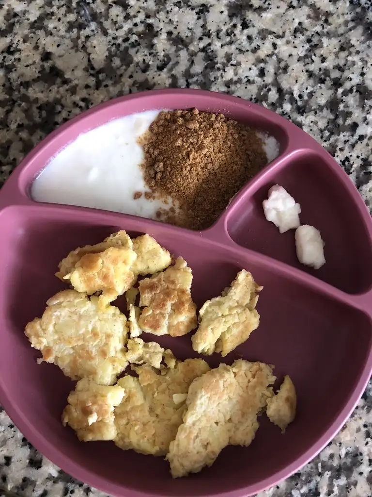 Yeni bişey yapmadım kızlar dünden kalan patatesli yumurtayı yedirdim, yoğurdun üzerindeki geçenlerde pekmezli kurabiye yapmıştım ya onu robotta çekip kavanoza koydum daha pratik oldu 3 tatlı kaşığı yoğurt 1,5 tatlı kaşığı kurabiye tozu var orada
