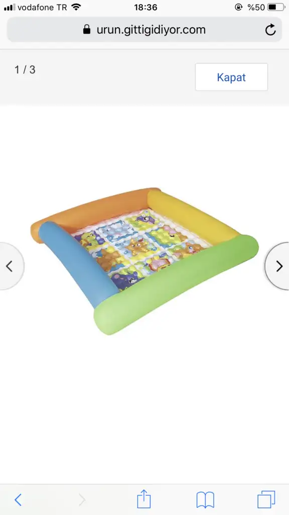 Bu degil ama bu gibi bez kenarları aparatlı olanlar vardi halan daha acaba ondanmi alsaydim icine kucuk toplari doldururdum diye dusunyorumBöyle bir oyun halısı kullanmış olan var mı?Instagramda münhan çınarda gördüm. Fiyatı 80 tlye düşmüş gittigidiyorda. Yuvarlansa bile halı içinde kalacak olması hoşuma gitti. Ama işte şişme acaba ne kadar süre kullanılır bilemedim Kararsız kaldım kullanan başka birileri vardır belki öneren var mıdır